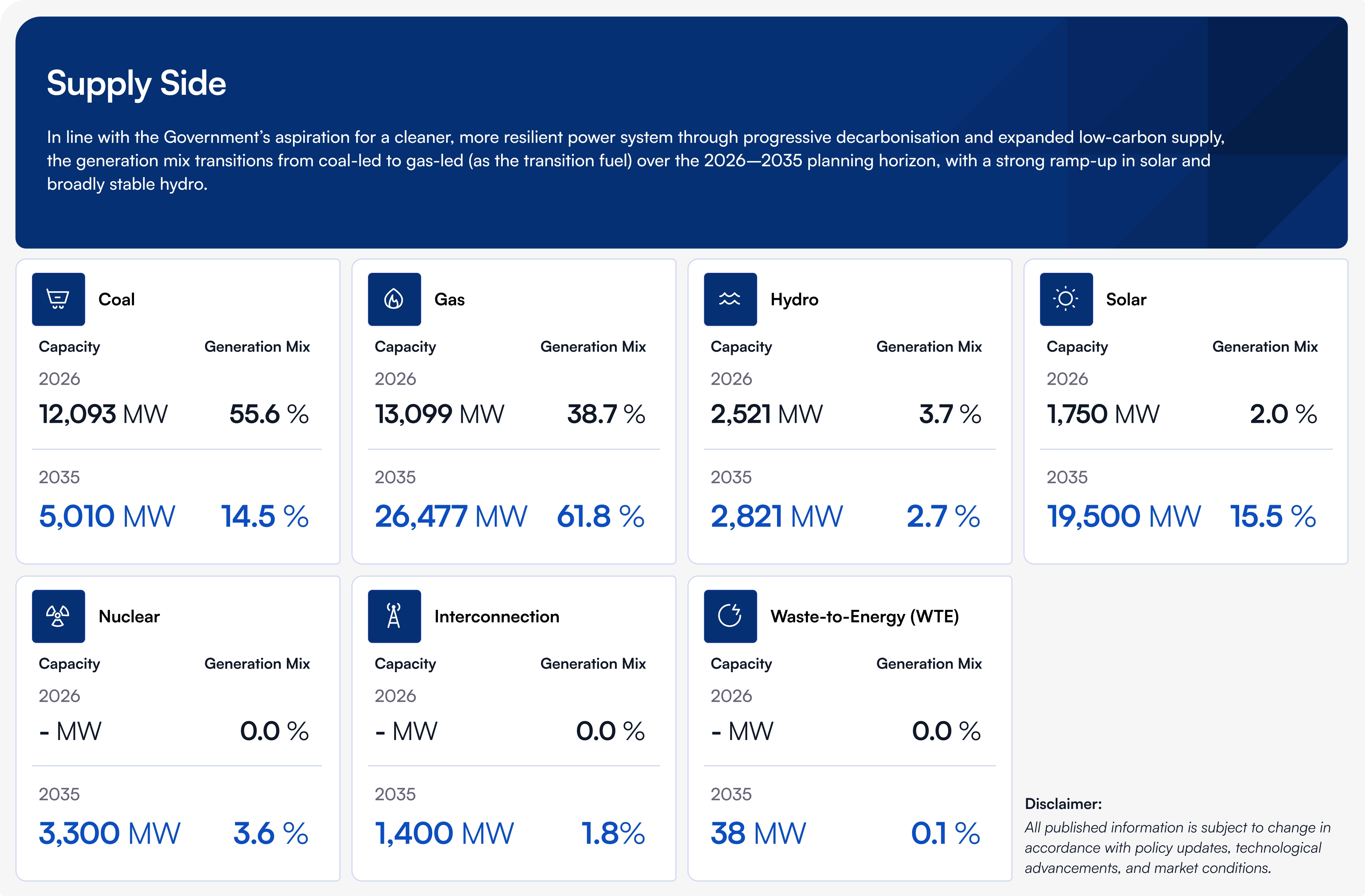 The summary view below outlines the projected evolution of Peninsular Malaysia’s electricity supply mix over the next decade. It presents the expected installed capacity by fuel type, namely coal, gas, hydro, and solar, together with each source’s share of the overall generation mix. The outlook indicates a gradual transition in the supply composition: while coal and gas remain significant contributors, renewable sources, particularly hydro and solar, are expected to increase steadily, reflecting a broader shift toward cleaner and more sustainable electricity generation. This projection is provided to support forward planning, anticipate changes in the generation profile, and inform strategies aligned with Malaysia’s future energy priorities.