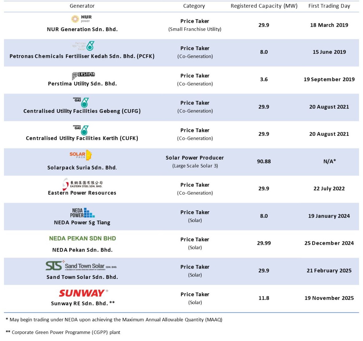 Currently, there are eleven (11) participants registered under NEDA with total capacity of 301.77 MW as shown below: